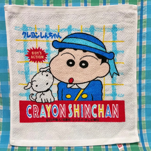 昔顔のクレヨンしんちゃんのハンドタオル! 園服を着たしんちゃんがかわいい〜 レトロですがしっかり未使用品なので、気にせずお使いになれます! 33cm正方形くらいのサイズです! 平成レトロ クレヨンしんちゃん しんちゃん ハンドタオル タオル ハンカチ レトロ